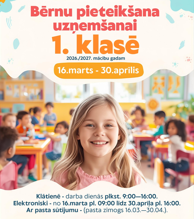 Uzņemšana 1. klasē NOTIKS NO 16. MARTA LĪDZ 30. APRĪLIM.